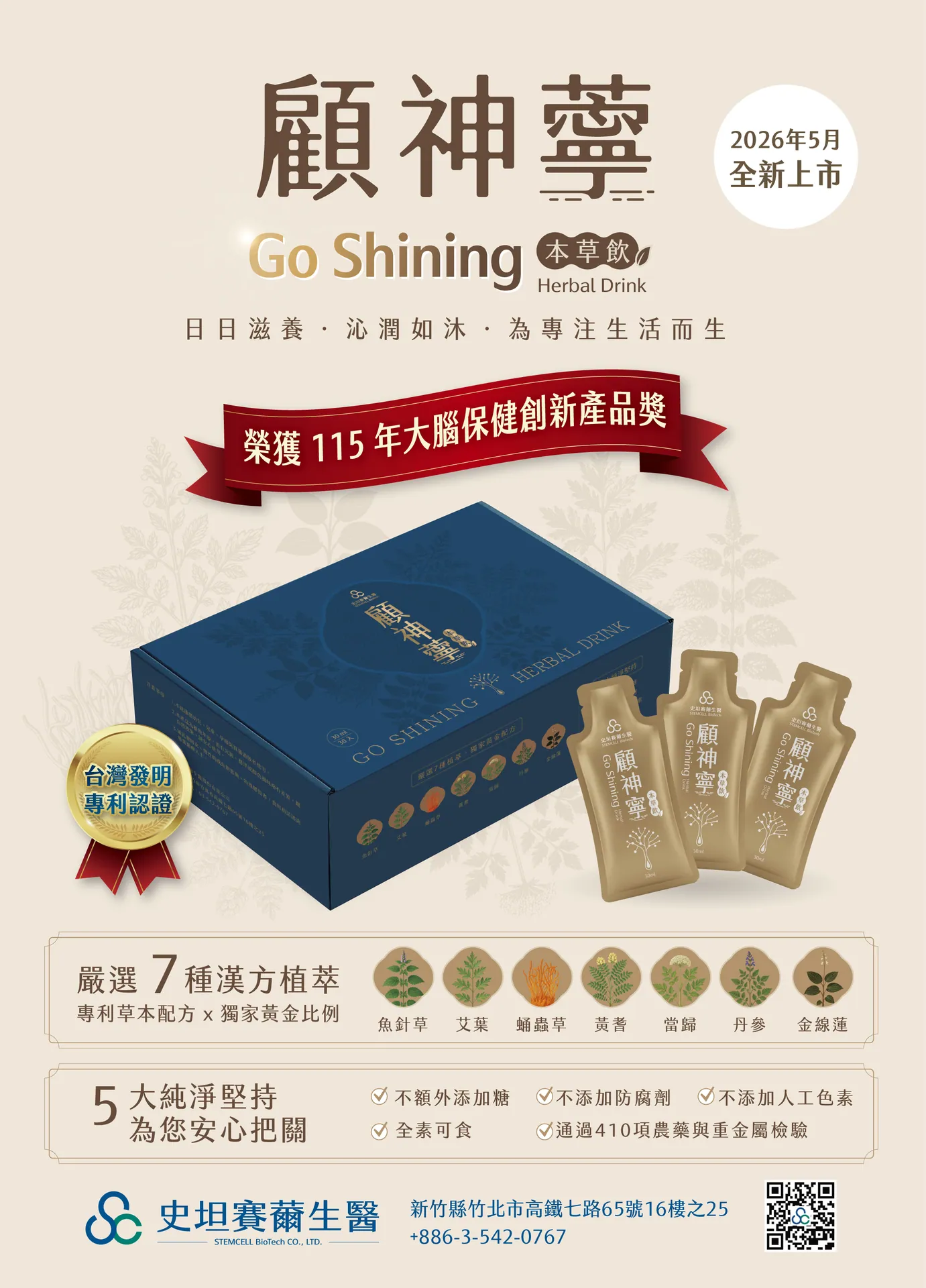 史坦賽薾生醫指出,「顧神薴本草飲」以漢方植萃為核心,嚴選金線蓮、丹參、蛹蟲草等7種中草藥製成,相關配方比例已取得台灣發明專利核准(專利字號:I922252);產品並結合現代製程技術,採用液態萃取與一日份鋁袋包裝設計,兼顧隨身攜帶與日常飲用便利性。